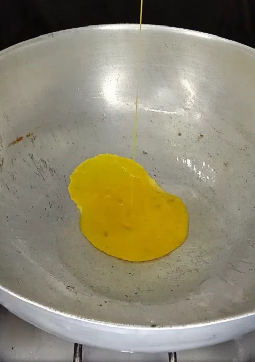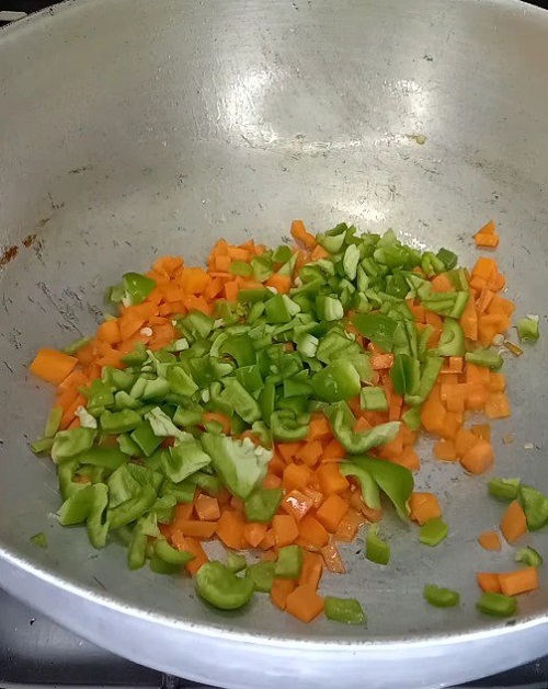 سخني مقلاة أو مقلاة كبيرة على نار متوسطة إلى عالية وأضيفي القليل من الزيت. يُسكب البيض المخفوق في المقلاة ويُخفق حتى ينضج تمامًا. أخرجي البيض من المقلاة واتركيه جانباً. في نفس المقلاة، أضيفي المزيد من الزيت إذا لزم الأمر وأضيفي الخضار المقطعة. قم بتحريكها حتى تصبح طرية ولكن مقرمشة.