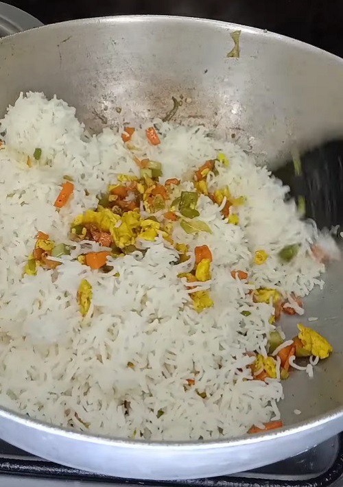 بعد ذلك، أضف الأرز المطبوخ إلى المقلاة، وقم بتفتيت أي كتل باستخدام ملعقة. تُسكب صلصة الصويا وزيت السمسم، وتُخلط جميع المكونات جيداً. أعد تقديم البيض المخفوق واختيارك من البروتين في المقلاة، مع الجمع بين جميع المكونات حتى يتم دمجها جيدًا. تذوقي واضبطي التوابل حسب تفضيلاتك.