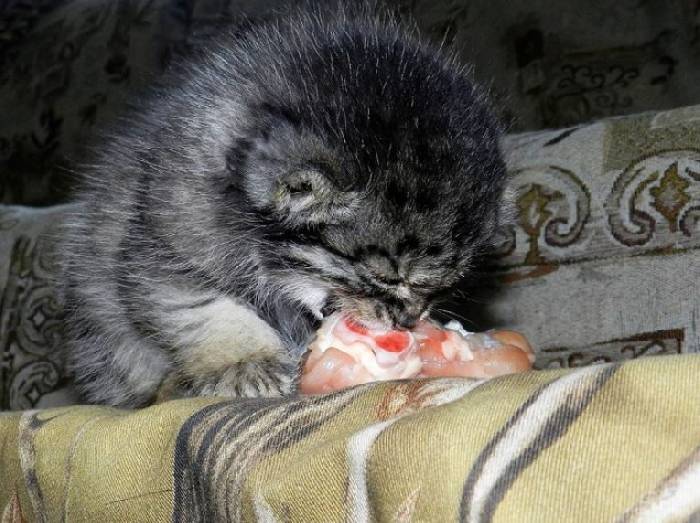 Dasha sleeps in an improvised hole made of a cardboard box. When the kitty got stronger, they began to feed her with a special mixture. And at 1.5 months, she had already tasted meat.