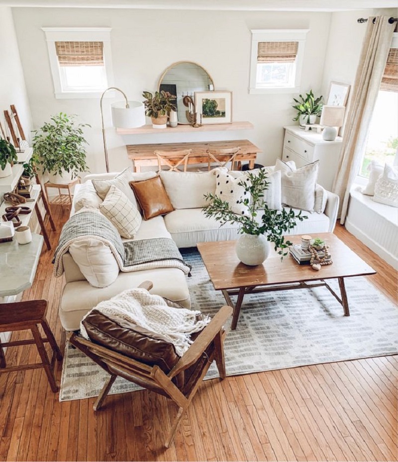 Farmhouse decor exudes warmth and simplicity. Infuse your living room with rustic elements like distressed wood, neutral color palettes, and vintage-inspired furnishings. Think wooden coffee tables, cozy throws, and a rustic mantel.