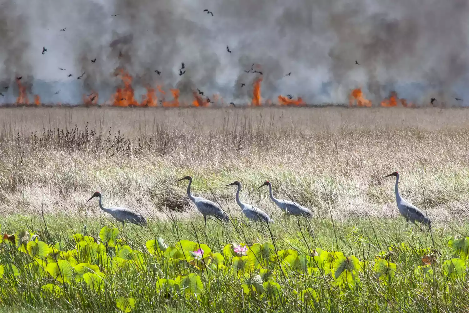 “From the Arnhem Highway near Mamukala wetlands in Kakdu I saw a typical dry season grassfire. Kites were hovering above the flames to snoop down and snatch fleeing prey. What made the scene special was a contrasting element; a green patch of waterlillies where some brolgas were staying well away from the blaze. Being upwind of the billowing smoke I had a clear enough view to capture the dramatically different relationship between the two groups of birds and their fiery environment.” — Carolyn Vasseleu