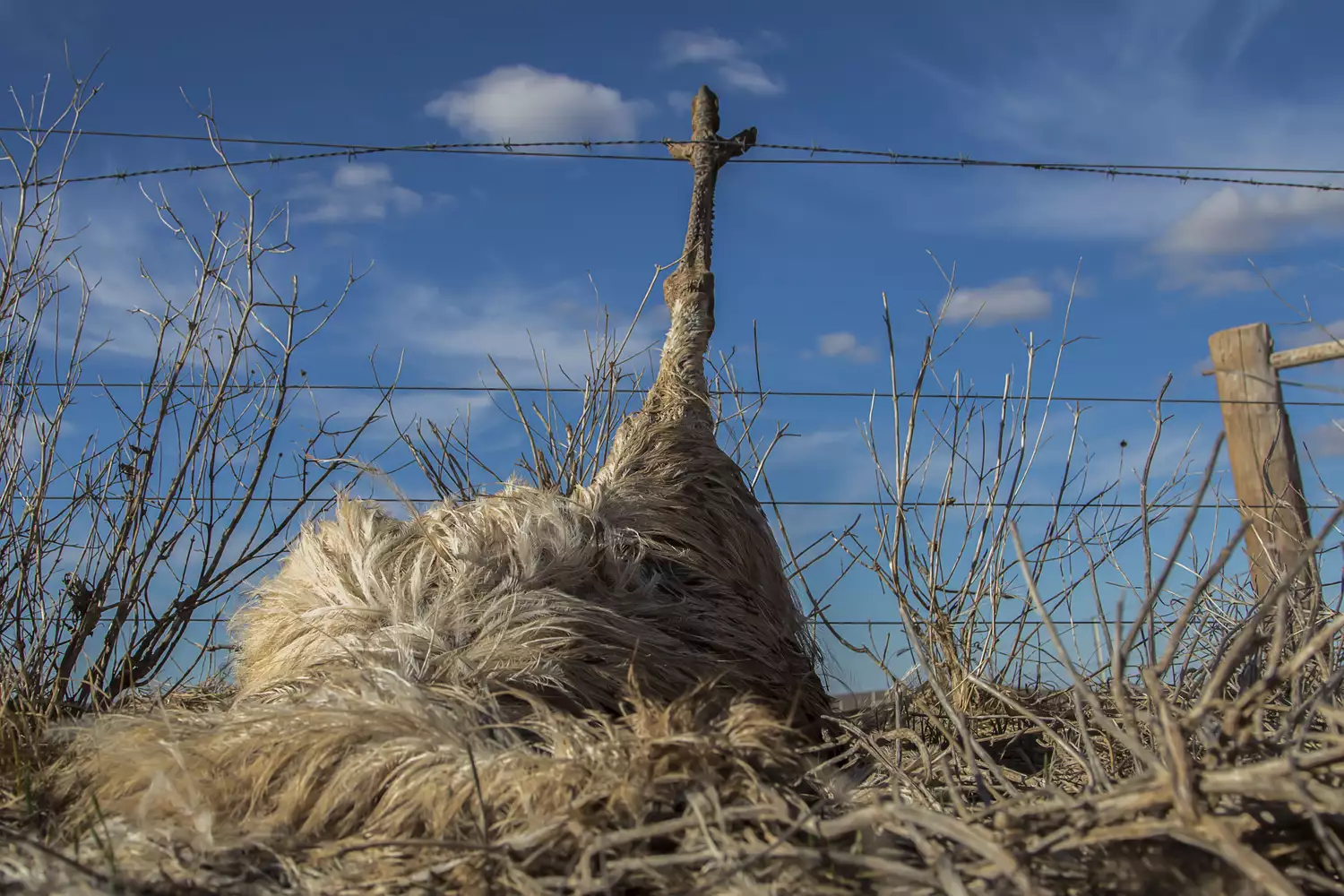 “We were driving along a remote dirt road near Burra SA when we noticed an emu foot pointing skyward along a fence line. Investigation revealed the bird had become entangled while attempting to traverse a barbed wire fence. Unable to free itself it was left to die of exposure to the elements. A tragic end.” — Danny McCreadie