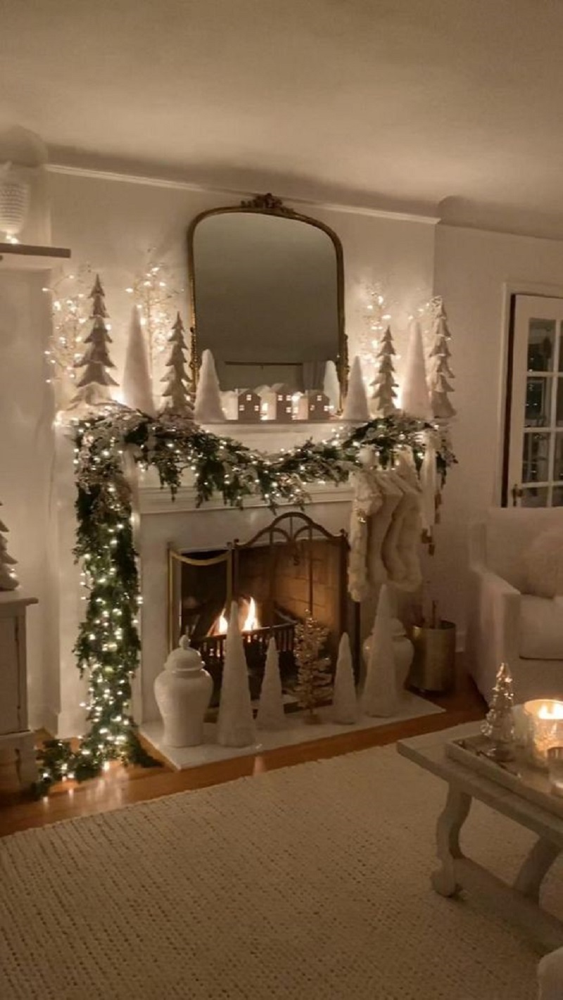 To break up the monochromatic look, add greenery accents like garlands and wreaths. These elements provide a touch of nature and contrast to the white decor.