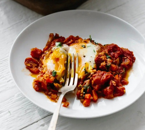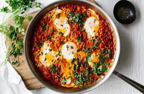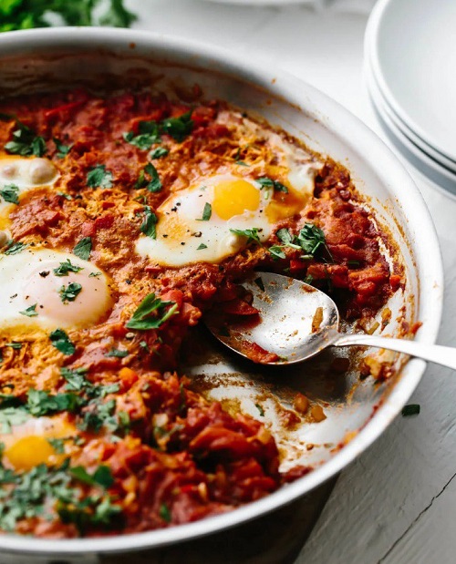 To elevate your shakshuka to culinary brilliance, garnish it with a generous handful of freshly chopped cilantro and parsley. These vibrant herbs not only add a burst of color but also infuse the dish with freshness and vitality. Serve the shakshuka hot, directly from the skillet, with crusty bread or warm pita, allowing your taste buds to revel in the harmonious blend of flavors and textures.