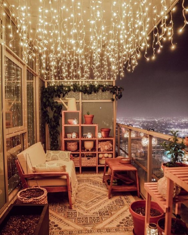 Create a magical atmosphere with string lights. Drape them along the railing or overhead to cast a warm and inviting glow, perfect for evenings on your small balcony.